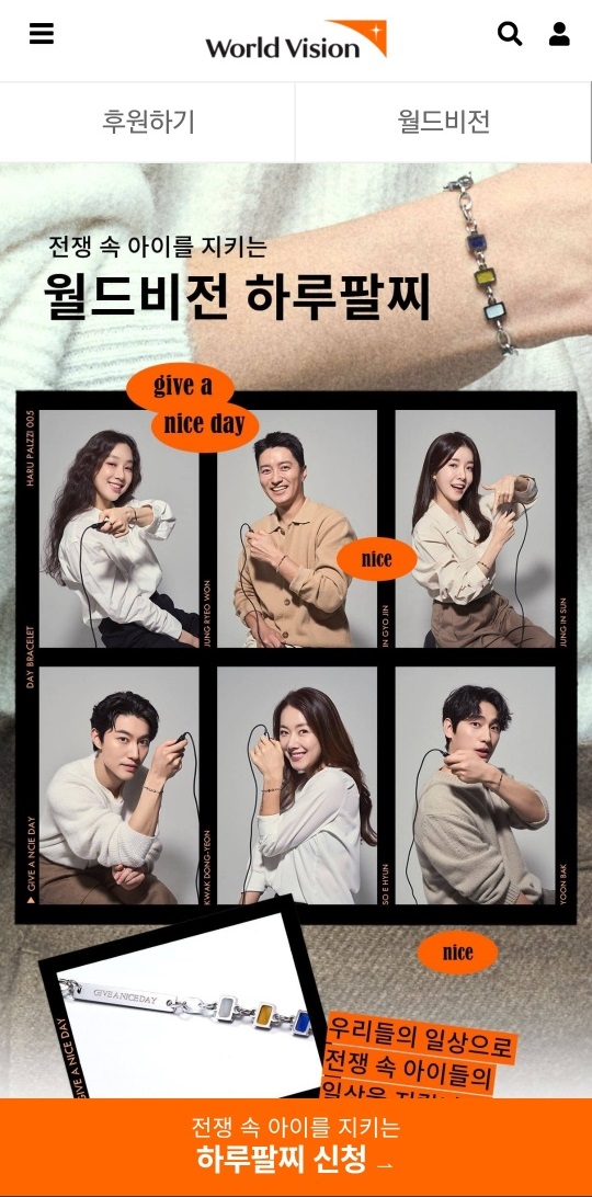 GIVE A NICE DAY! 전쟁 속 아이들을 지키기 위해 나선 정려원, 인교진, 소이현, 윤박, 정인선, 곽동연 배우. 하루팔찌를 하는 사람이 많아질 수록 더 많은 아이들에게 안전한 일상을 선물할 수 있습니